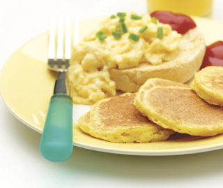 1. Tip the sweetcorn into the liquidiser followed by the cornflour, baking powder and egg. Season with salt and pepper, then blend on a low speed of 2 or 3 for 5-8 seconds to form a chunky batter with bits of sweetcorn in it. Break the eggs for scrambling into a bowl and give them a good whisk.